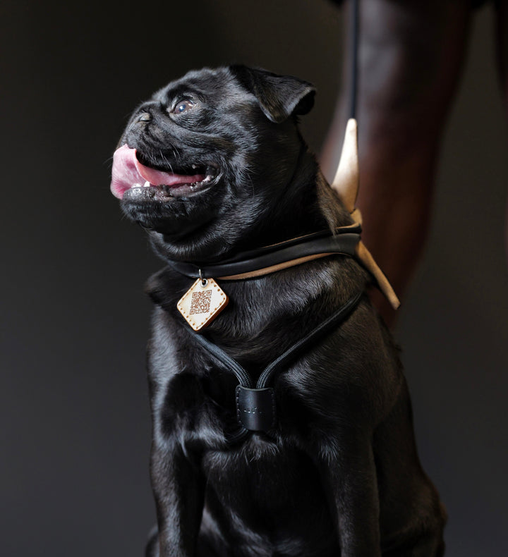 The Ray Harness is 100% handmade and an exclusive, utility patent-pending design that is constructed to make your everyday routine easier. Using a single piece of padded, soft synthetic silk fiber rope and finished with Rocky vegetable-tanned leather from Tuscany, Italy, we have designed a system that will allow you to attach and detach your pet’s harness in a fluid movement. Now offered in a sleek all-black design, from rope to leather to buckle, it delivers a clean, modern look while maintaining the perfect balance of comfort, utility, and style. Designed for dog parents who value comfort, adaptability, and modern style in classic black, perfect for daily walks and urban adventures.